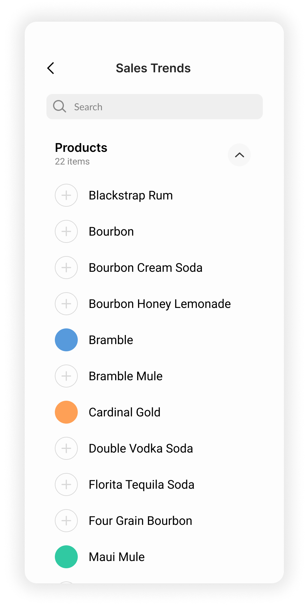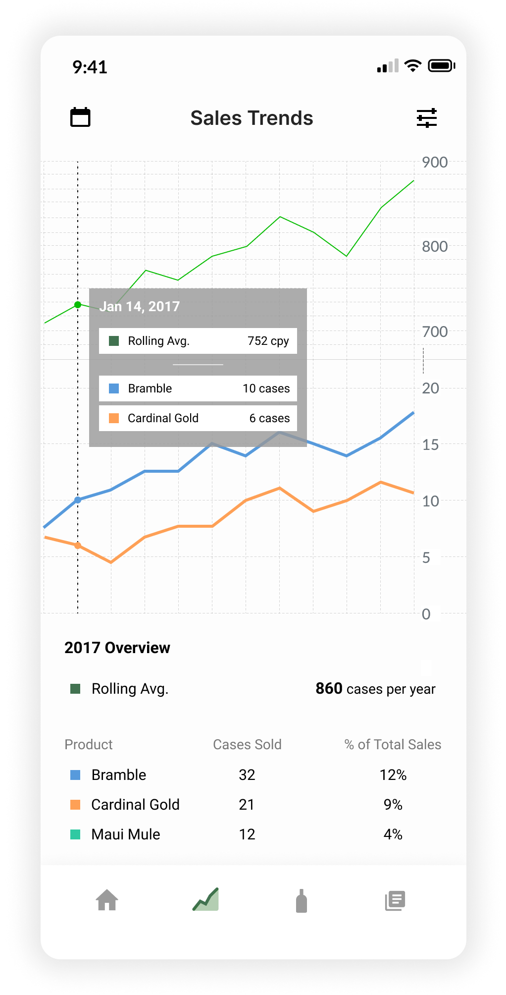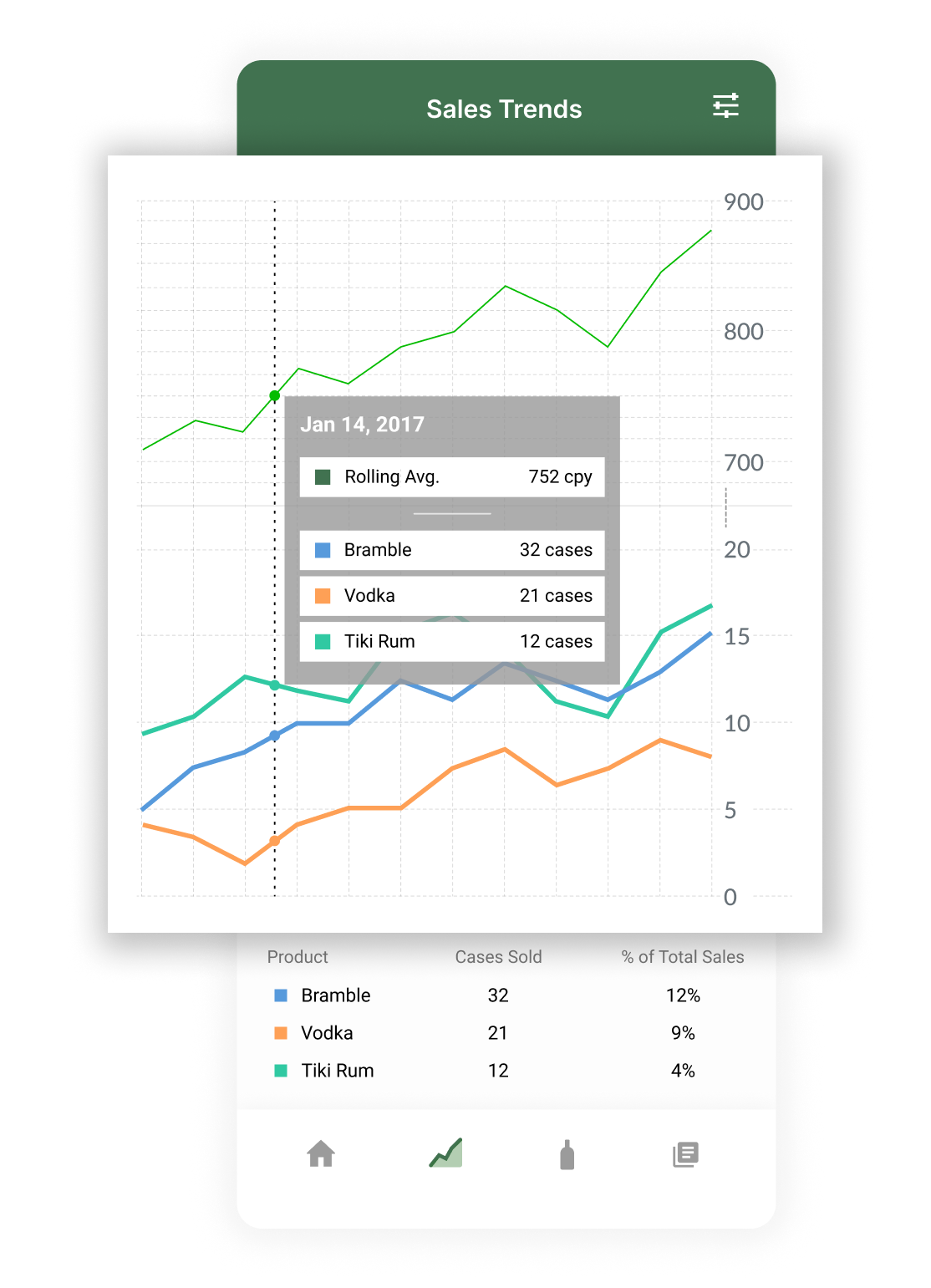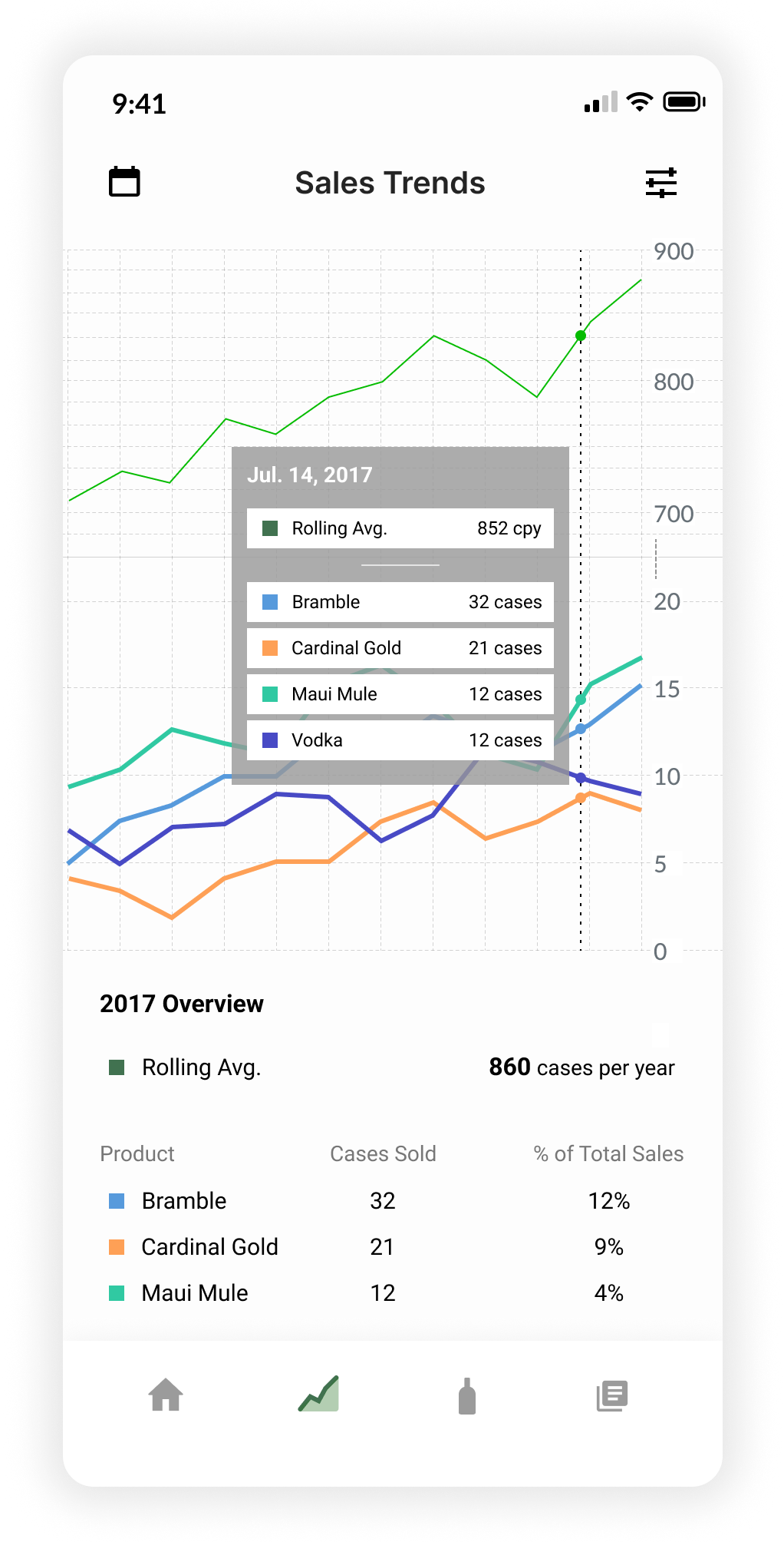 With a quick glance, you can find principal sales information and have an understanding of where the company’s sales currently stand. See the total number of products sold, and set goals and track your progress towards them. You can also compare current sales with sales from the previous year by looking at the rolling average.