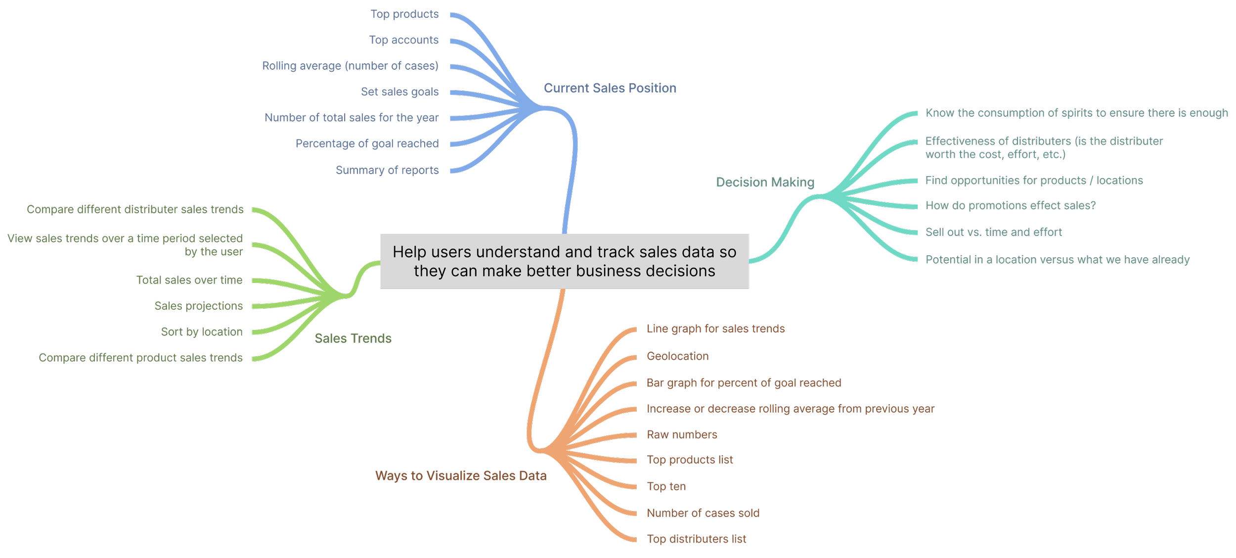 We then went through the ideas and discussed which of them would best support the main purpose of the application: How can we help users understand and track sales data so they can make better business decisions?
