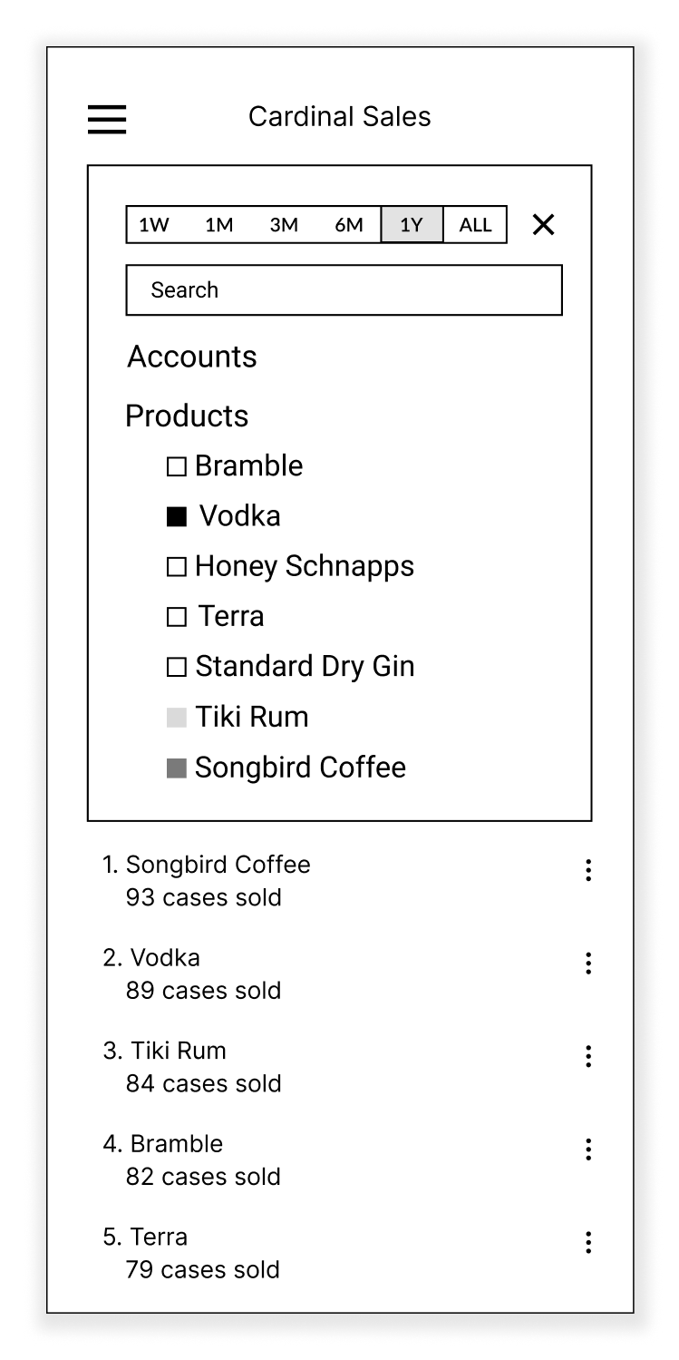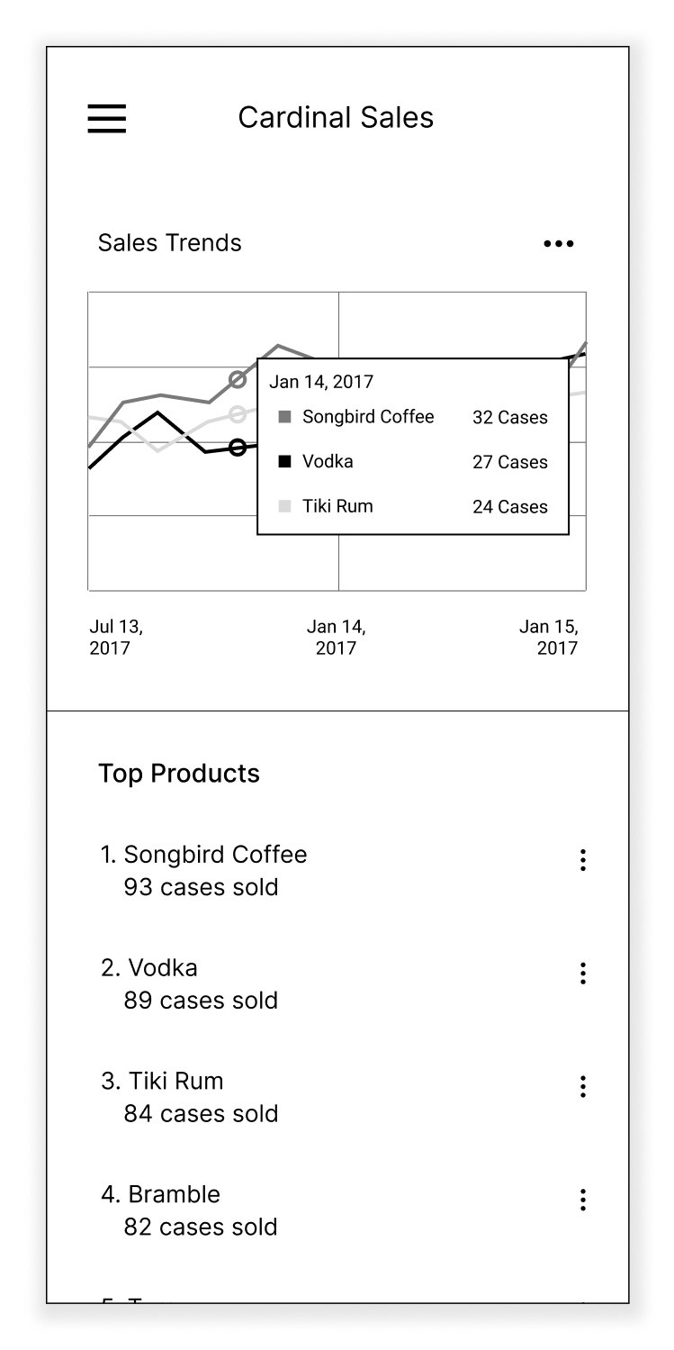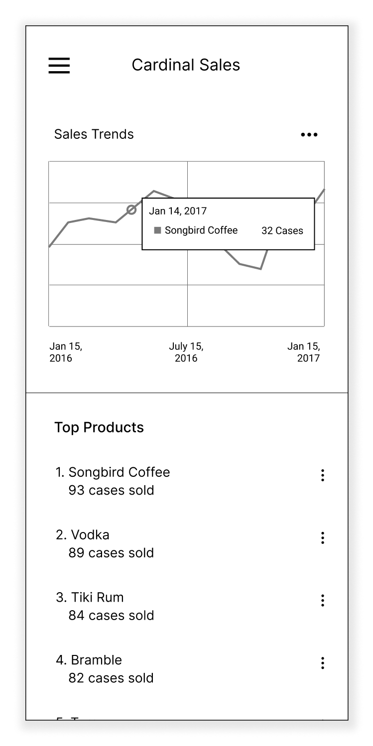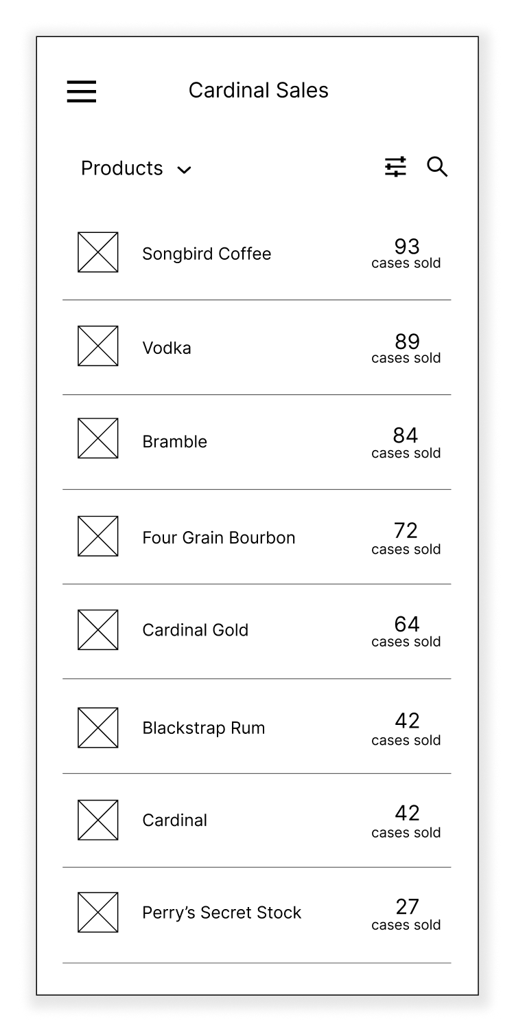 Stakeholders at Cardinal Spirits needed a way to track the sales made by the company, and they needed a clear way to see and understand the sales data in order to help them make decisions for the company’s products and business operations. Before developing the app, stakeholders were relying on spreadsheets to track sales data, and they found that spreadsheets were frustrating and arduous to use.
