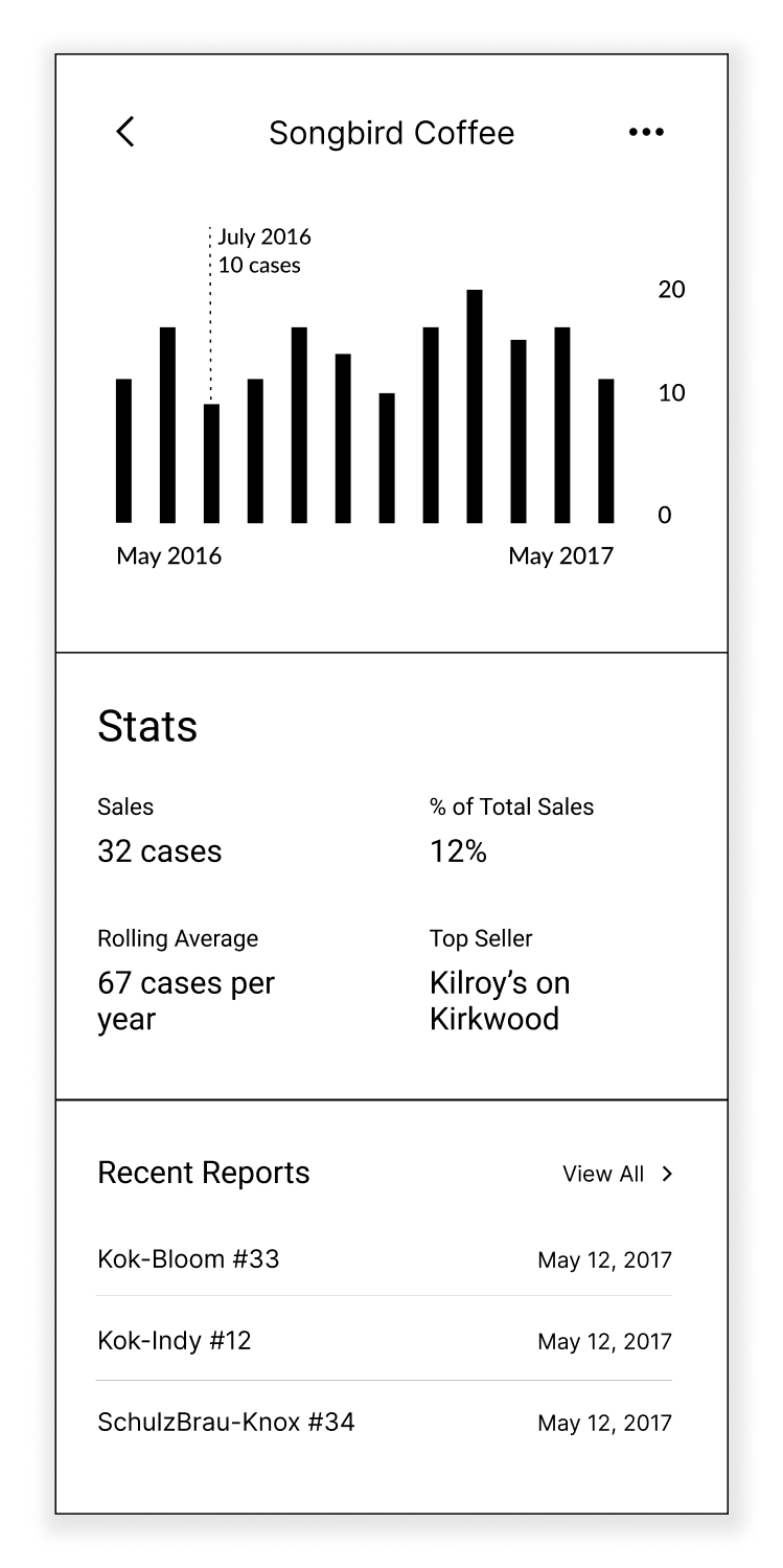 With our research findings in mind, our team brainstormed solutions together. We attempted to come up with as many ideas as we could about different possibilities for organizing and presenting sales data that would be helpful to the user. “What kind of graphs could we use?” “Can sales trends all fit on one customizable graph, or will we need multiple?” “What are the crucial pieces of data that a user needs to see in order to quickly get an idea of where sales currently stand?”