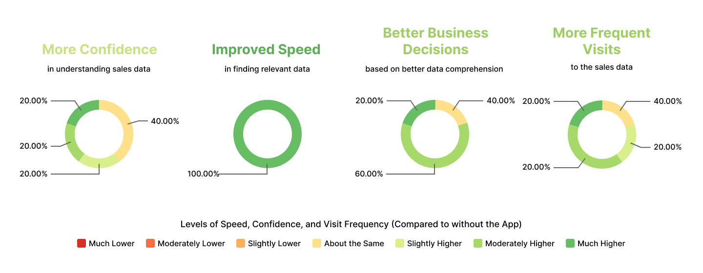 I was able to gather a lot of feedback on the prototype, from users with different time constraints, different preferences towards viewing sales data, and different familiarity levels with interacting with sales data. Here's a summary of how people rate their own confidence in understanding the sales trends data, their speed in finding the particular sales data they’re looking for, how frequently they will look at sales data compared to how frequently they do now, and their confidence in making business decisions based on their knowledge of the sales data from using the application.